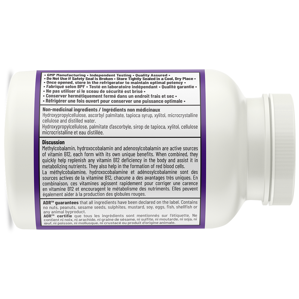 Tri B12 Synergie d’AOR est une combinaison de trois formes actives et indépendantes de vitamine B12. La méthylcobalamine, l’hydroxocobalamine et l’adénosylcobalamine sont trois facteurs de cobalamine distincts, chacun ayant des avantages qui lui sont spécifiques. Prises ensemble, elles fournissent une dose appropriée de formes biodisponibles et actives de B12 pour un soutien complet dans la compensation d’une carence. La carence en vitamine B12 peut résulter d’une mauvaise alimentation, une altération du microbiote ou une malabsorption causée par des maladies comme la maladie de Crohn ou la maladie cœliaque ou l’utilisation d’inhibiteurs de la pompe à protons tels que les antiacides. Les populations particulièrement à risque comprennent les personnes âgées, les végétaliens, les fumeurs. L’utilisation chronique d’antibiotiques et même des facteurs génétiques peuvent également augmenter le risque.