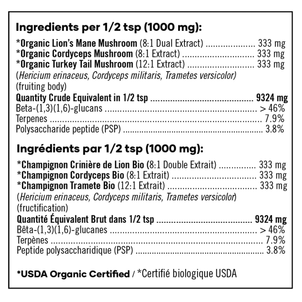 3 Mushroom Blend a été créé pour vous aider à commencer votre journée avec des intentions saines. Ajouter 1/2 cuillère à café (1 g) de ce mélange à vos smoothies, thés, cafés, flocons d'avoine ou yaourts du matin aidera à soutenir votre système immunitaire, votre niveau d'énergie et votre fonction cérébrale. Nous ne pouvons pas penser à une meilleure façon d'optimiser le potentiel d'une journée formidable!