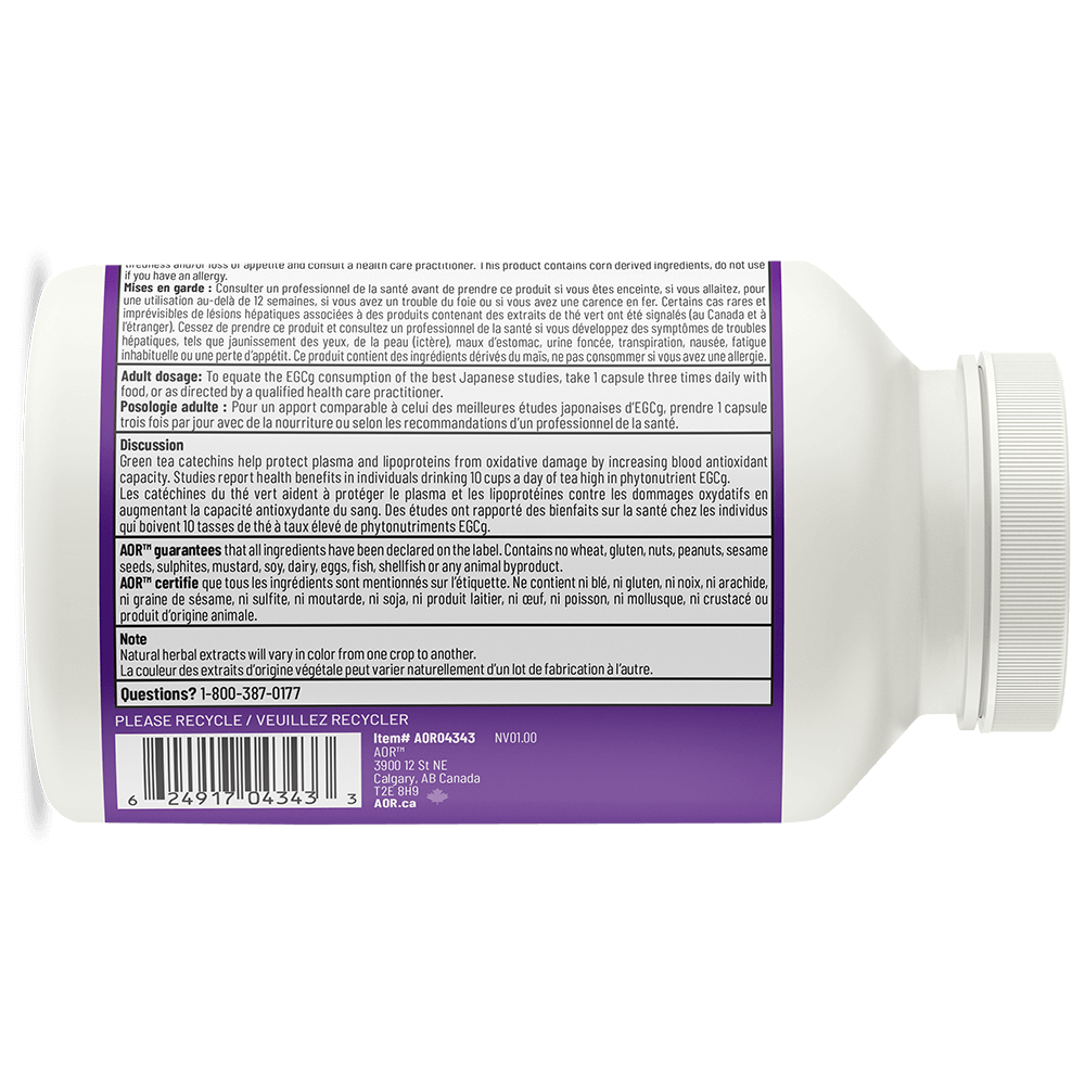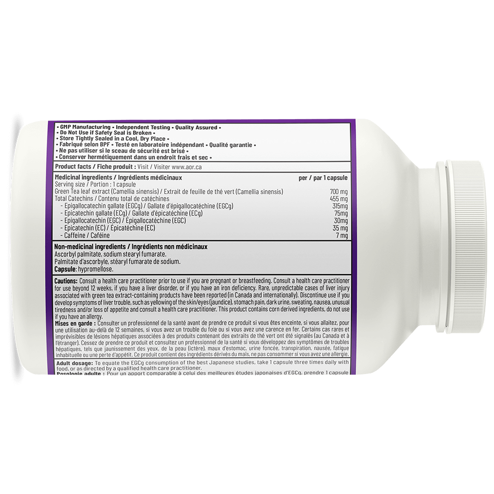 Le thé vert fournit de puissants antioxydants et favorise la longévité, la santé cardiovasculaire, un poids corporel approprié, la croissance et la différenciation cellulaires normales, la santé du foie et bien plus. Le Thé Vert Actif d’AOR est un extrait de thé vert de haute efficacité et standardisé, riche en épigallocatéchine gallate (EgCG), une molécule considérée comme étant le principal phytonutriment responsable des bienfaits du thé vert sur la santé. Les études indiquent le plus souvent les effets bénéfiques du thé vert chez les personnes buvant quotidiennement 10 tasses du thé vert japonais de type sencha à forte teneur en EgCG, chaque verre de thé contenant l’équivalent de 150 mg d’EgCG. Sur leurs étiquettes, la grande majorité de produits à base d’extrait de thé vert surestime le nombre d’équivalents de tasses de thé contenus dans leurs capsules, ce qui les ramène au rang des thés de piètre qualité.