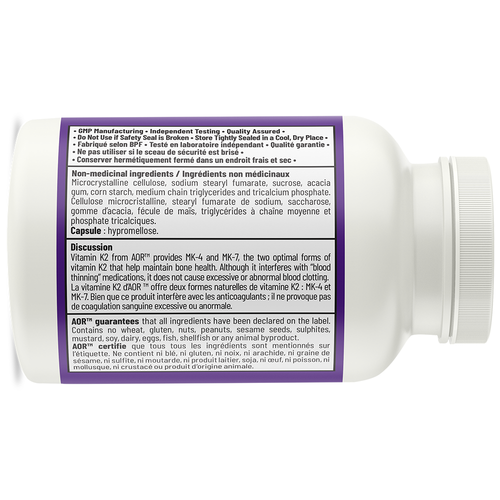 La vitamine K est une vitamine indispensable à la santé cardiovasculaire, osseuse et hépatique. La vitamine K2 est plus efficace que la vitamine K1, une forme trouvée dans les plantes pour ces effets spécifiques sur la santé. Il existe deux formes efficaces et populaires de vitamine K2 : MK-4 et MK-7. Bien que la MK-4 soit la forme active de la vitamine K2 utilisée par l’organisme et utilisée cliniquement au Japon depuis des décennies avec de bons résultats, il a également été démontré que la MK-7 donne de bons résultats à faible dose et de manière prolongée. La vitamine K2 d’AOR fournit un mélange 50/50 de MK-4 et MK-7 pour assurer le meilleur des deux mondes.